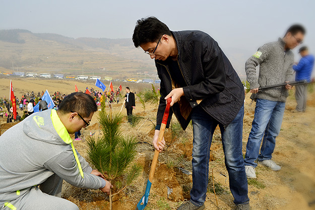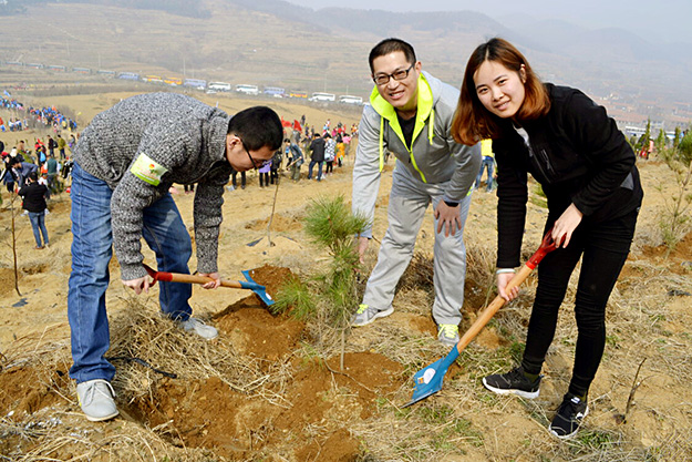 濃重的霧霾天氣并沒有影響到大家的植樹熱情,準時在市政府廣場集合。十時許,到達目的地,天空放晴,使大家的植樹熱情更加高漲。領(lǐng)上樹苗,拿上工具,互相配合,揮鍬鏟土、扶樹填土、忙得不亦樂乎。經(jīng)過一個上午的勞動,100多棵小松樹在綠化帶里 “安家落戶”。