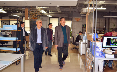 圖為羅鋒院長陪同省住建廳顧發(fā)全總工參觀我院辦公區(qū)